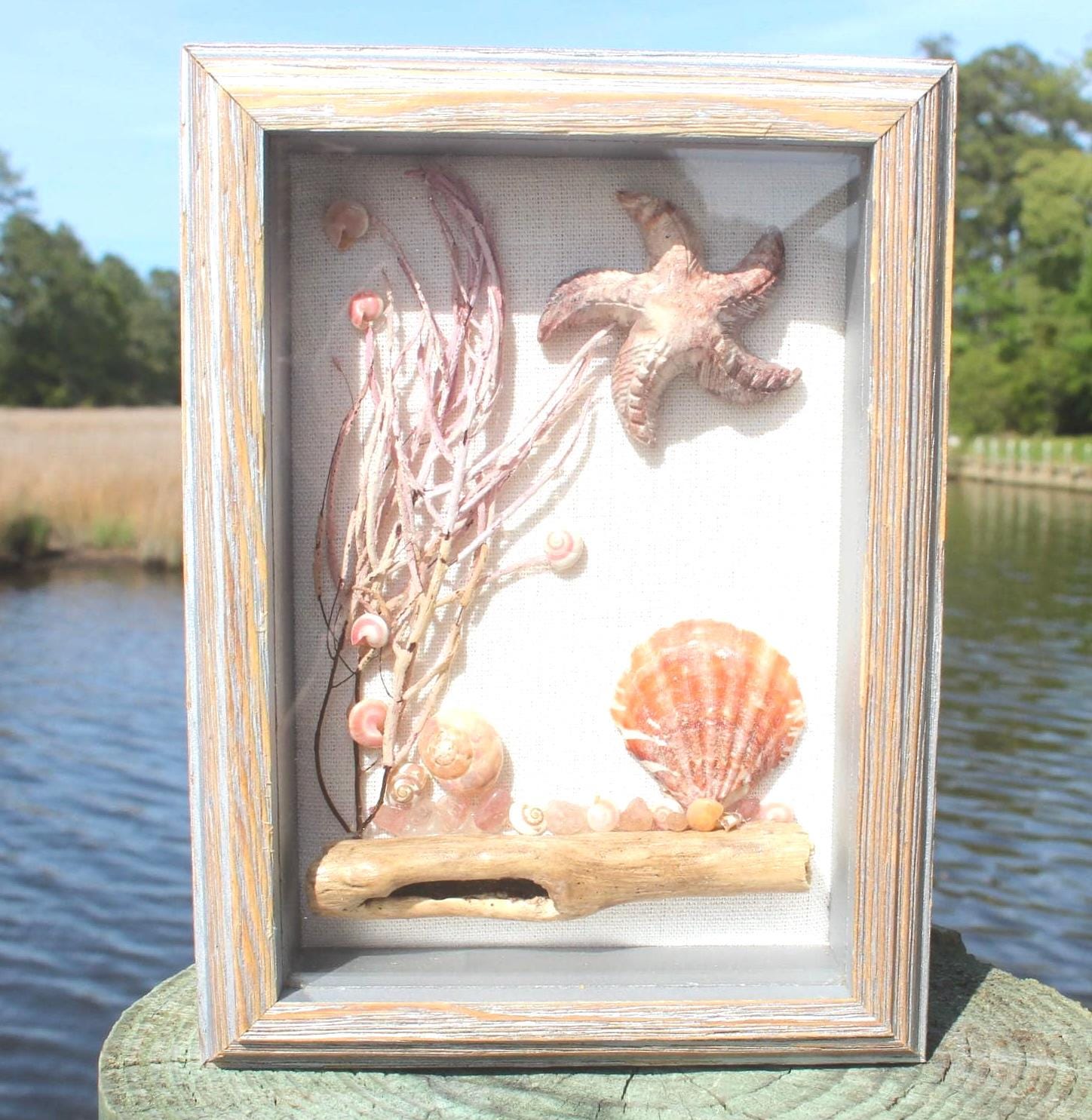 Ocean Theme Shadow Box, Handmade Shell Driftwood Coastal Home Décor. Weathered Wood Frame.