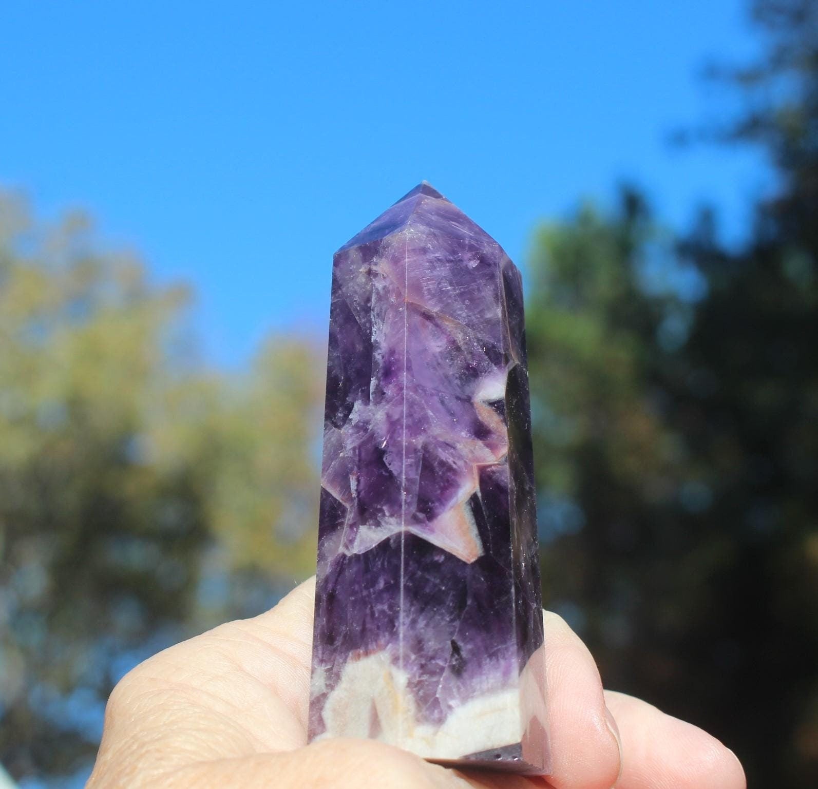 Chevron Amethyst Terminated Point/Wand. Purple Tower, Polished Crystal Obelisk High Quality.